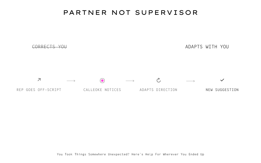When you go off-script — and you will, you're in the conversation, the AI isn't — Calleoke doesn't correct you. It adapts. You took things somewhere unexpected? Here's help for wherever you ended up.