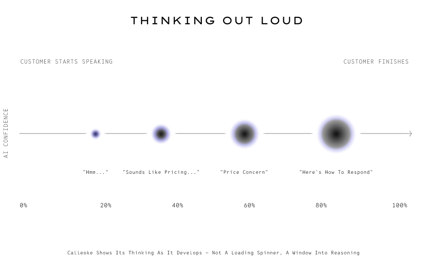Calleoke shows its thinking as it develops. Customer starts talking, you see: "Hmm, sounds like a concern..." Customer continues: "Looks like pricing..." Customer finishes: "Price objection — here's how to show ROI."