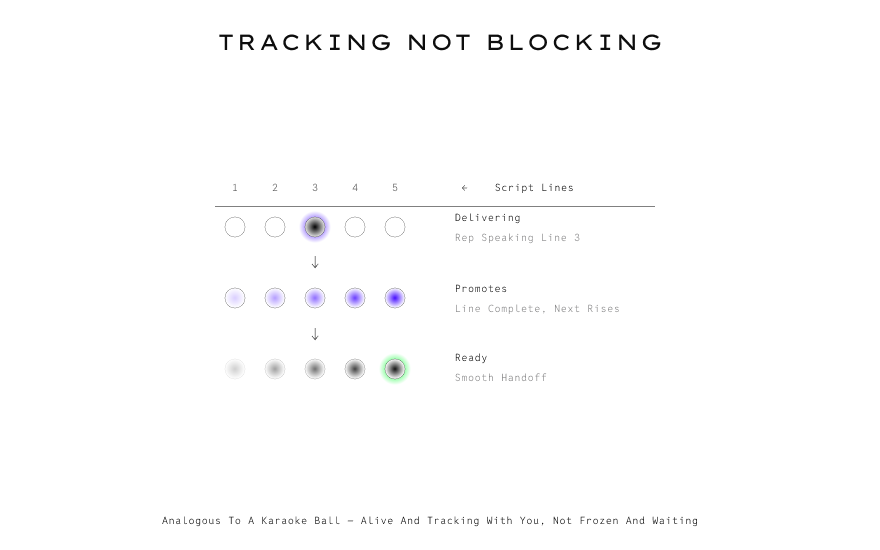 Lines light up as you speak. They fade when done. Next line promotes smoothly. If new suggestions need to appear, they queue up and arrive at natural pauses, not mid-sentence.